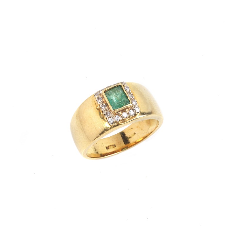 ANELLO A FASCIA CON SMERALDO E DIAMANTI in oro giallo e bianco 18kt, sulla sommità uno smeraldo taglio rettangolare di ct 0.30 circa, circondato da una fila di diamanti taglio huit huit per ct 0.10 circa, punzoni 750 e del fabbricante, mis. 53, gr. 6
