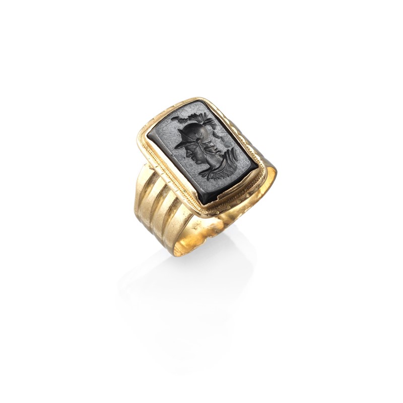 in oro a basso titolo, recante una una pietra onice con volto di soldato inciso, mis. 53, gr. 5
