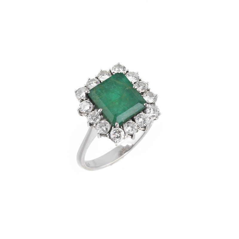 ANELLO A MARGHERITA CON SMERALDO E DIAMANTI in oro bianco 18kt, al centro uno smeraldo taglio ottagonale di ct 2 circa, circondato da una fila di diamanti taglio brillante per ct 1.40 circa, punzoni 750 e del fabbricante, mis. 55, gr. 5