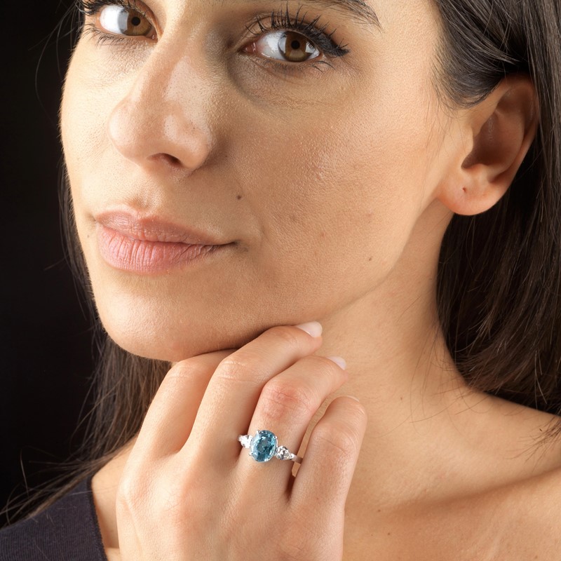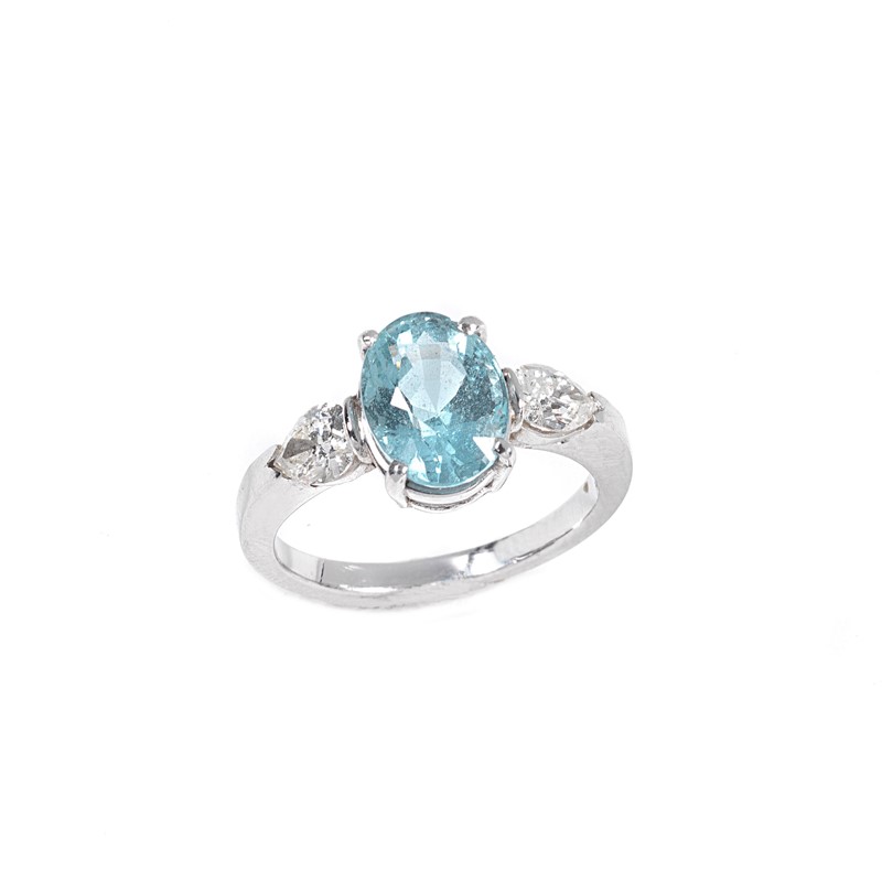 in oro bianco 18kt, al centro un'acquamarina taglio ovale di ct 2.60 circa affiancata da due diamanti taglio a goccia per ct 0.80 circa, mis. 55, gr. 4
