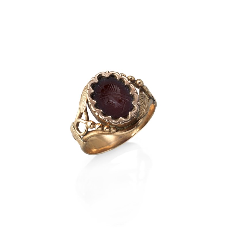 in oro a basso titolo, fascia realizzata seguendo un motivo a tralci volti a trattenere una corniola incisa, mis. 64, gr. 6