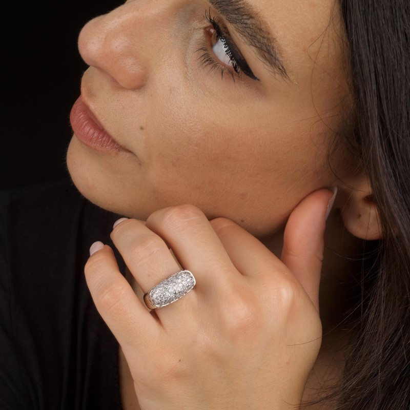 in oro bianco 18kt, a forma di "tronchetto", impreziosito da pavé di diamanti taglio brillante per ct 0.80 circa, punzone 750, mis. 55, gr. 6