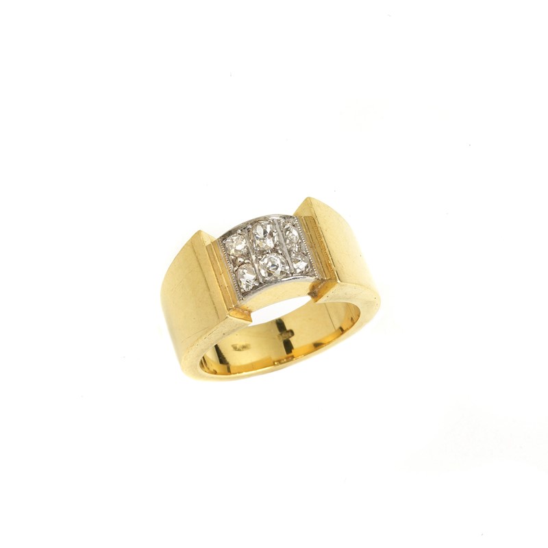 in oro giallo e bianco 18kt, impreziosito sulla sommità da diamanti taglio vecchio per ct 0.40 circa, punzoni 750 e del fabbricante, mis. 51, gr. 7