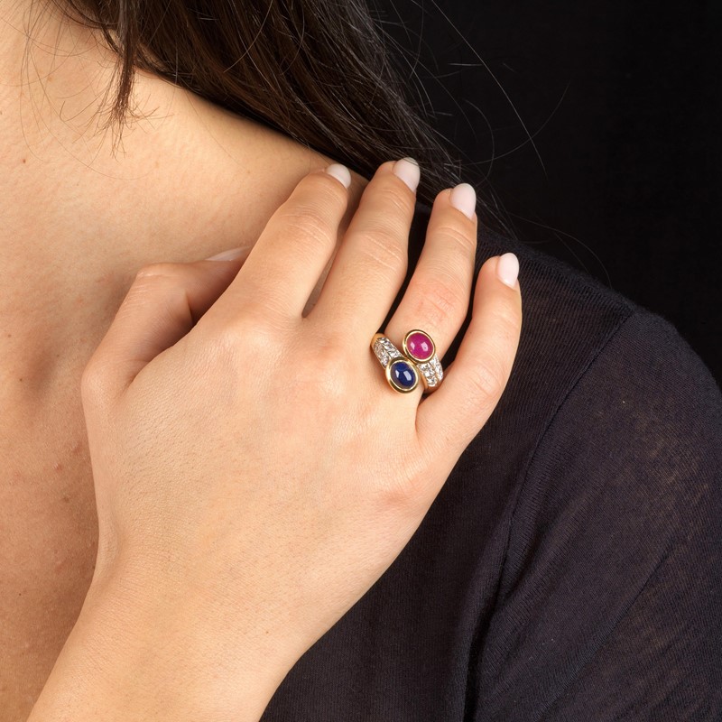 in oro giallo 18kt, agli apici un rubino e uno zaffiro taglio cabochon per ct 5 circa affiancati da diamanti taglio brillante per ct 0.80 circa, mis. 56, gr. 9
