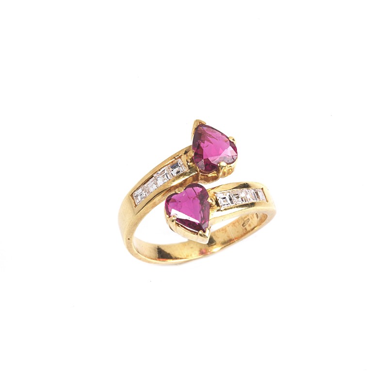 ANELLO CONTRARIE CON RUBINI E DIAMANTI in oro giallo 18kt, agli apici due rubini taglio a cuore per ct 1 circa affiancati da diamanti taglio carré per ct 0.40 circa, punzoni 750 e del fabbricante, mis. 53, gr. 5