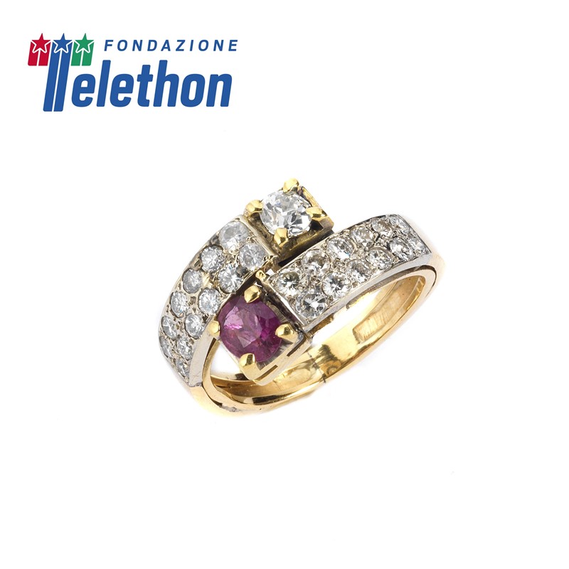 RUBY AND DIAMOND CONTRARIE RING IN 18KT TWO TONE GOLD
