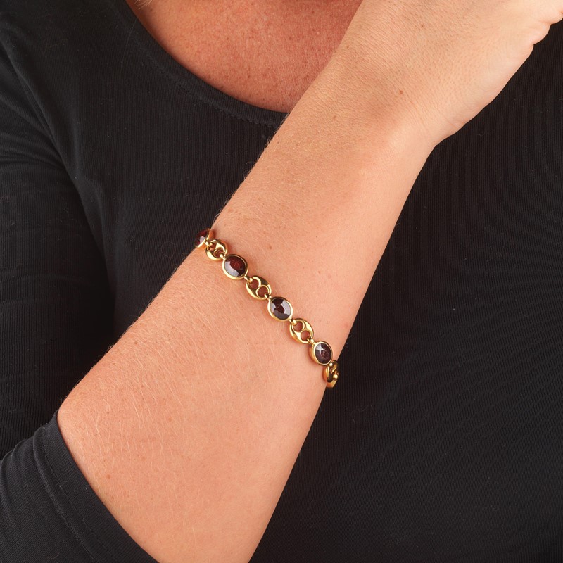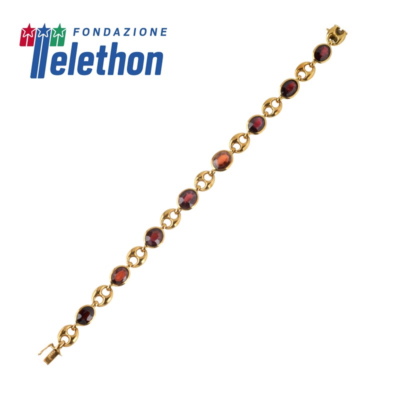 BRACCIALE A CATENA CON GRANATI in oro giallo 18kt, catena a maglia marina e distanziali con granati taglio ovale per ct 12 circa, lungh. cm 19, gr. 21