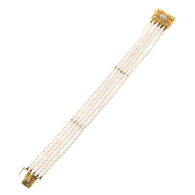 composto da cinque fili di perle di mm 2 circa, fermatura e distanziali in oro giallo e bianco 18kt, con piccoli diamanti taglio brillante e huit huit per ct 0.10 circa, punzone 750, lungh. cm 18,5, gr. 16