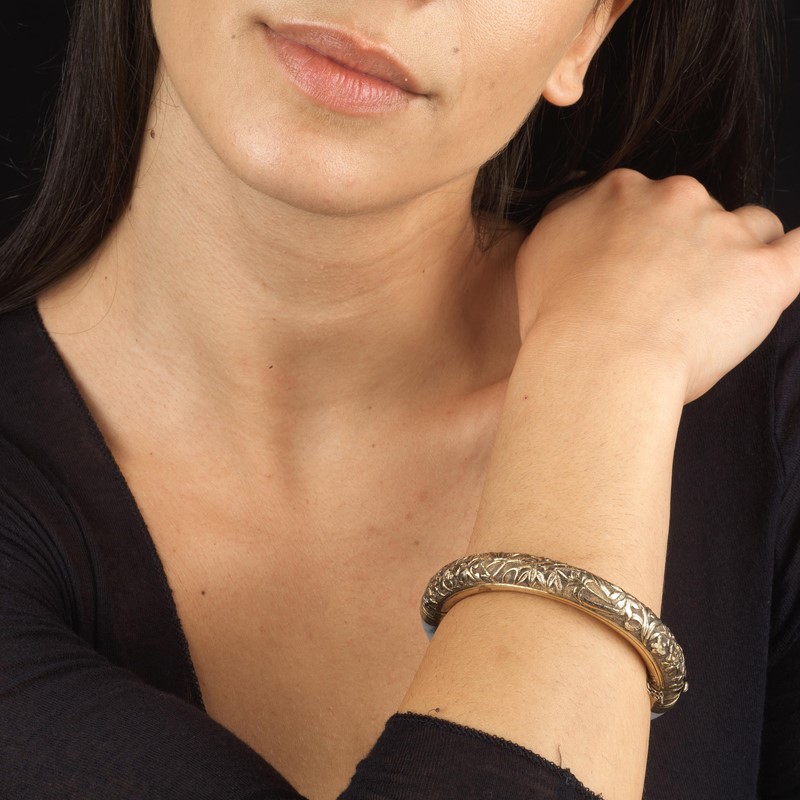 in oro a basso titolo e pietra dura, raffigurante sulla sommità un motivo a tralci fioriti, dim. cm 8x8 circa, diam. interno cm 6, gr. 57