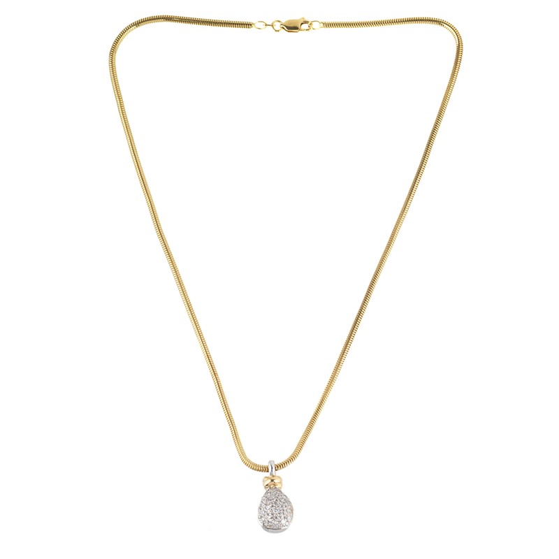 COLLANA CON PENDENTE in oro giallo e bianco 18kt, composta da catena tubolare e ciondolo impreziosito da diamanti taglio brillante per ct 0.50 circa, punzoni 750 e del fabbricante, chiusura a moschettone, lungh. cm 40, gr. 19