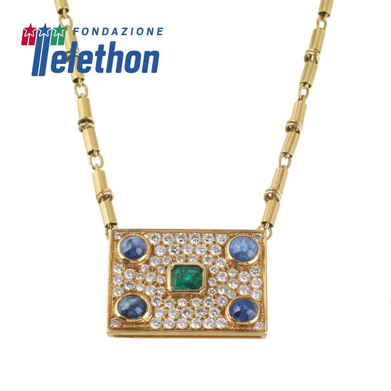 COLLANA CON PIETRE DI COLORE E DIAMANTI in oro giallo 18kt, composta da catena ed elemento centrale di forma rettangolare impreziosito da zaffiri taglio cabochon per ct 3 circa, uno smeraldo taglio ottagonale di ct 0.80 circa e diamanti taglio brillante per ct 2.30 circa, punzoni 750 e del fabbricante, chiusura a moschettone, lungh. cm 50, gr. 34