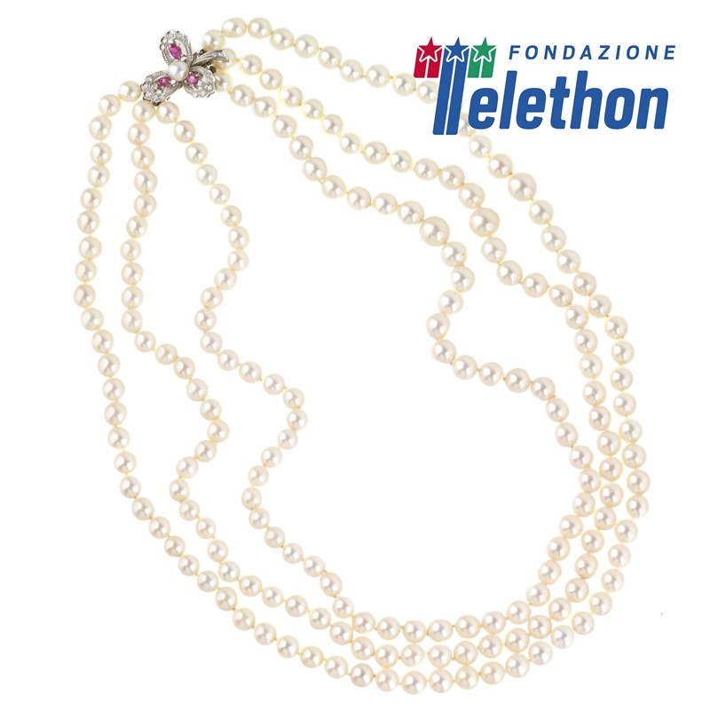 COLLANA DI PERLE CON RUBINI E DIAMANTI composto da tre fili di perle di mm 7 circa, fermatura a forma di trifoglio impreziosita da tre rubini taglio a goccia per ct 0.60 circa e diamanti taglio huit huit per ct 0.20 circa, punzoni 750 e del fabbricante, lungh. cm 50, gr. 122