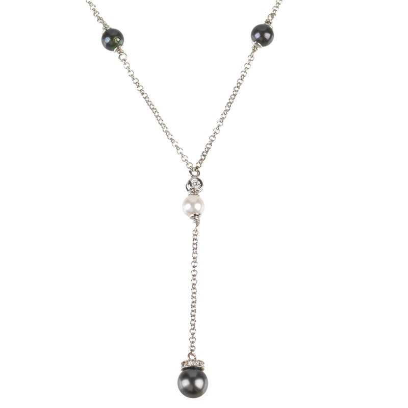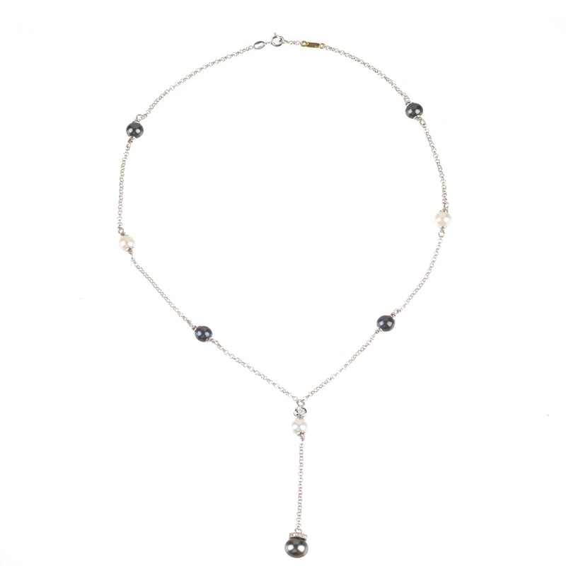 in oro bianco 18kt, composta da catena e perle bianche e grigie di mm 6 circa, punzoni 750 e del fabbricante, con parte centrale pendente lunga cm 5,5, impreziosita da diamanti taglio brillante, lungh. cm 42, gr. 10