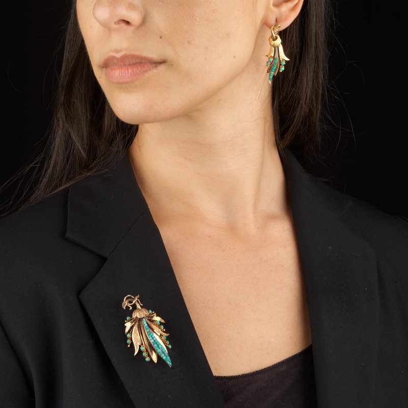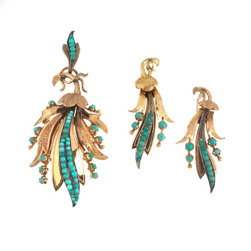DEMI PARURE A FORMA DI TRALCI CON TURCHESI in oro e argento, composto da spilla/pendente e paio di orecchini realizzati a forma di tralci e impreziositi da piccoli turchesi taglio cabochon, dim. spilla 3x6 circa, lungh. orecchini cm 4, gr. 22 complessivi