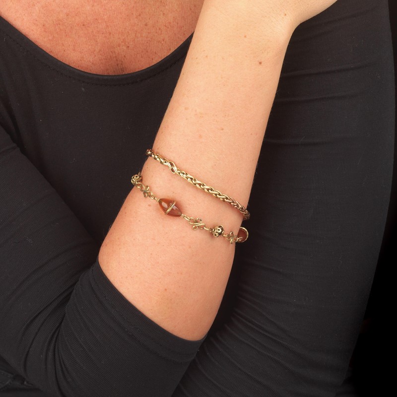 DUE BRACCIALI A CATENA di cui uno in oro giallo e rosa 18kt con catena realizzata a spiga, lungh. cm 21, accompagnato da un bracciale in oro giallo 18kt, realizzato seguendo un motivo a intreccio con distanziali in pietra dura, lungh. cm 20, gr. 30 complessivi