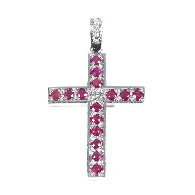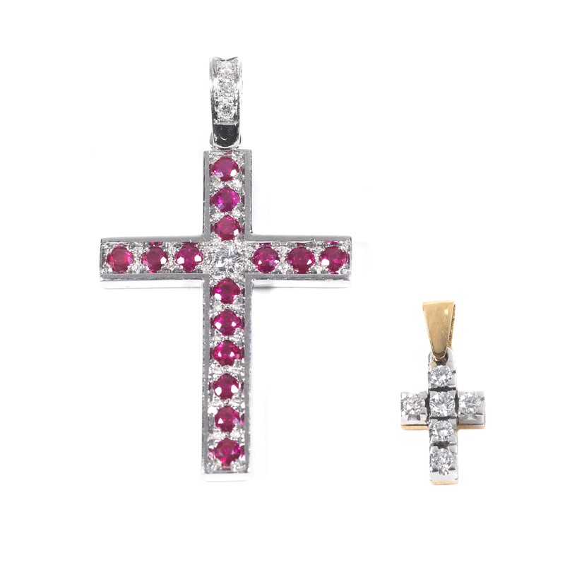 DUE PENDENTI A FORMA DI CROCE di cui uno in oro bianco 18kt, impreziosito da rubini taglio rotondo per ct 0.50 circa e diamanti taglio brillante per ct 0.10 circa, dim. cm 2x3,5, accompagnato da un secondo ciondolo in oro giallo e bianco 18kt, impreziosito da diamanti taglio brillante per ct 0.20 circa, dim. cm 1x1,5, gr. 4 complessivi circa