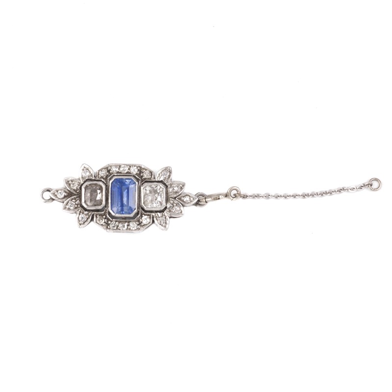 in oro bianco 18kt, a forma di tralci impreziositi da diamanti taglio vecchio (difetti) per ct 0.60 circa, con al centro uno zaffiro taglio ottagonale di ct 0.90 circa, corredata di catena, dim. cm 3x1,5 circa, gr. 6