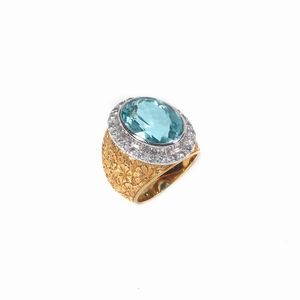 ANELLO A FASCIA CON ACQUAMARINA E DIAMANTI in oro giallo e bianco 18kt, raffigurante un disegno floreale inciso, [..]