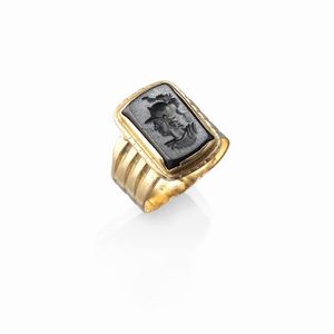 ANELLO A FASCIA in oro a basso titolo, recante una una pietra onice con volto di soldato inciso, mis. 53, gr. [..]
