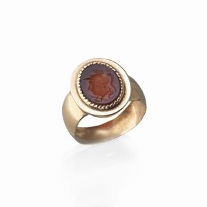 ANELLO A FASCIA CON CORNIOLA in oro a basso titolo, recante al centro una corniola raffigurante un profilo maschile [..]