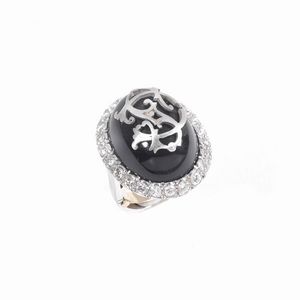ANELLO A CUPOLA CON ONICE E DIAMANTI in oro bianco 18kt, composto da una pietra in onice cinta da una fila di [..]