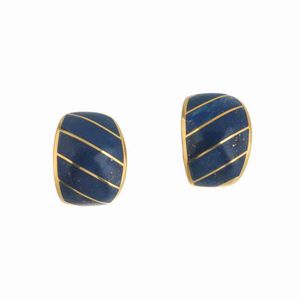 PAIO DI ORECCHINI CON LAPISLAZZULI in oro giallo 18kt e intarsi in laspislazzuli, punzone 750, dim. cm 1,5x2, [..]