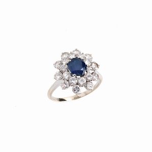 ANELLO A FORMA DI FIORE CON ZAFFIRO E DIAMANTI in oro bianco 18kt, al centro uno zaffiro taglio ovale di ct 1.50 [..]