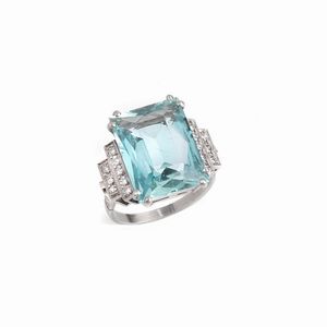 ANELLO CON ACQUAMARINA E DIAMANTI in oro bianco 18kt, impreziosito da un'acquamarina taglio fantasia di ct 9 [..]