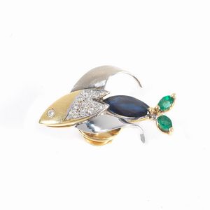 SPILLO A FORMA DI PESCE CON PIETRE DI COLORE E DIAMANTI in oro giallo e bianco 18kt, impreziosito da uno zaffiro [..]