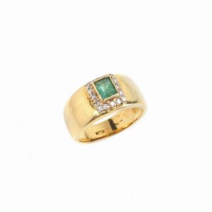 ANELLO A FASCIA CON SMERALDO E DIAMANTI in oro giallo e bianco 18kt, sulla sommità uno smeraldo taglio [..]