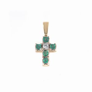 PENDENTE A FORMA DI CROCE CON DIAMANTE E SMERALDI in oro giallo 18kt, impreziosito da smeraldi taglio carré [..]