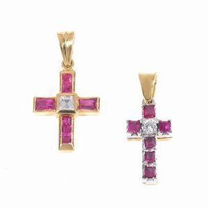 DUE PENDENTI A FORMA DI CROCE di cui uno in oro giallo 18kt, impreziosito da rubini taglio carré e baguette [..]