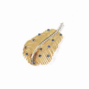 SPILLA A FORMA DI FOGLIA CON ZAFFIRI E DIAMANTI in oro giallo e bianco 18kt, lavorata a cordicella, impreziosita [..]