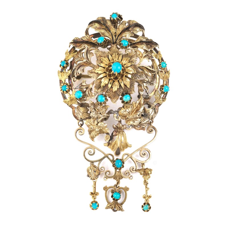 BIG CLUSTER BROOCH WITH TURQUOISES IN GOLD