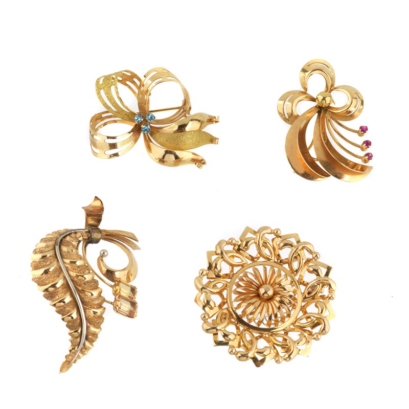 GROUP OF FOUR BROOCHES IN 18KT YELLOW GOLD