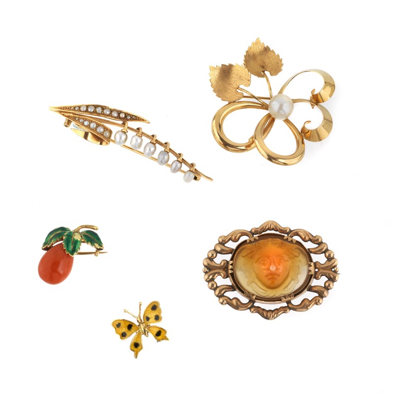 GRUPPO DI SPILLE composto da tre spille in oro a basso titolo impreziosite da perle ed una pietra dura accompagnate da due piccole spille in oro giallo 18kt a forma di frutto e farfalla decorate in smalti policromi di dim. cm 2x2 circa, gr. 28 complessivi