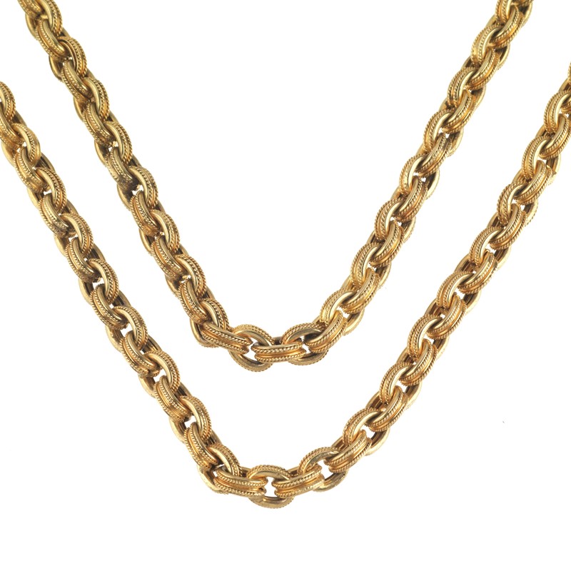 in oro a basso titolo, realizzata a doppio filo con una serie di maglie concatenate, chiusura a moschettone, lungh. cm 104 circa, gr. 119
