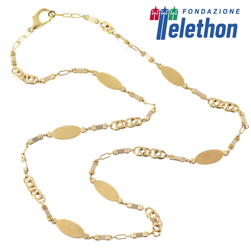 LUNGA COLLANA A CATENA in oro giallo e bianco 18kt, realizzata con elementi concatenati e piastrine come distanziali, punzoni 750 e del fabbricante, chiusura a moschettone, lungh. cm 108, gr. 175