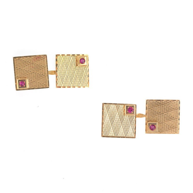 in oro giallo 18kt, decorati con un motivo a chevron e impreziositi da pietre rosse taglio rotondo, punzone del fabbricante, dim. cm 1x3, gr. 10 complessivi