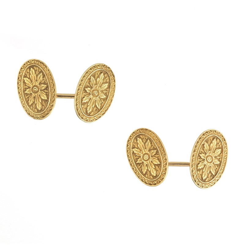 in oro giallo 18kt, di forma ovale, con motivo floreale inciso, punzoni 18kt e del fabbricante, dim. cm 1,5x2,5, gr. 7 complessivi