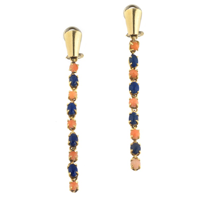 PAIO DI LUNGHI ORECCHINI PENDENTI CON CORALLO ROSA E LAPISLAZZULI in oro giallo 18kt, composti da una lunga fila di coralli alternati a lapislazzuli taglio cabochon, lungh. cm 8, gr. 14 complessivi