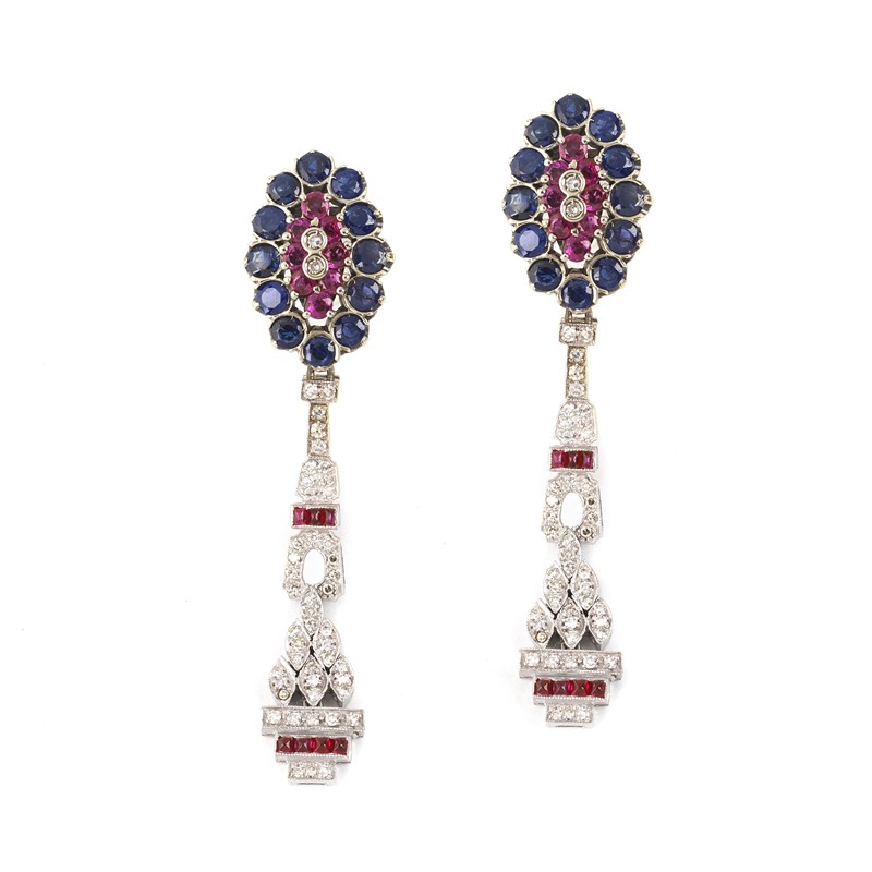 PAIO DI LUNGHI ORECCHINI PENDENTI CON PIETRE DI COLORE E DIAMANTI in oro bianco 18kt, impreziositi da zaffiri e rubini taglio rotondo per ct 3.60 circa e diamanti taglio huit huit per ct 0.80 circa, lungh. cm 5,5, chiusura a farfallina, gr. 14 complessivi