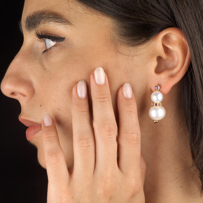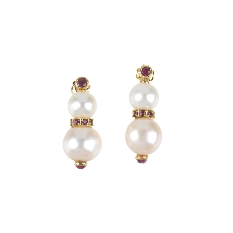 in oro giallo 18kt, composti da perle di mm 10-13 circa, impreziositi da rubini taglio rotondo per ct 0.60 circa, punzone 750, dim. cm 1,5x3,5, gr. 16 complessivi