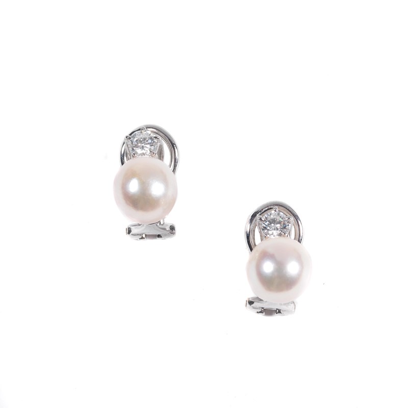 in oro bianco 18kt, impreziositi da perle di mm 9 circa, sormontate da diamanti taglio brillante per ct 0.40 circa, dim. cm 1x1,5, chiusura a clip con perno, gr. 5 complessivi