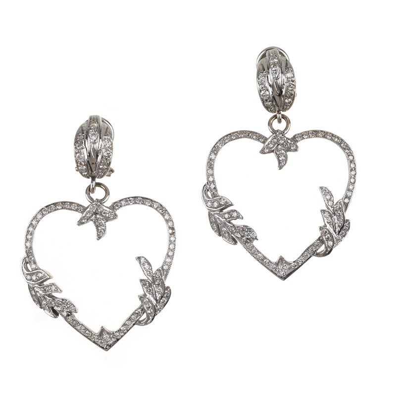 PAIO DI ORECCHINI PENDENTI A FORMA DI CUORE in oro bianco 18kt, realizzati a forma di cuori cinti da tralci impreziositi da diamanti taglio brillante per ct 1.60 circa, punzoni 750 e del fabbricante, dim. cm 3x5, chiusura a clip con perno, gr. 14 complessivi