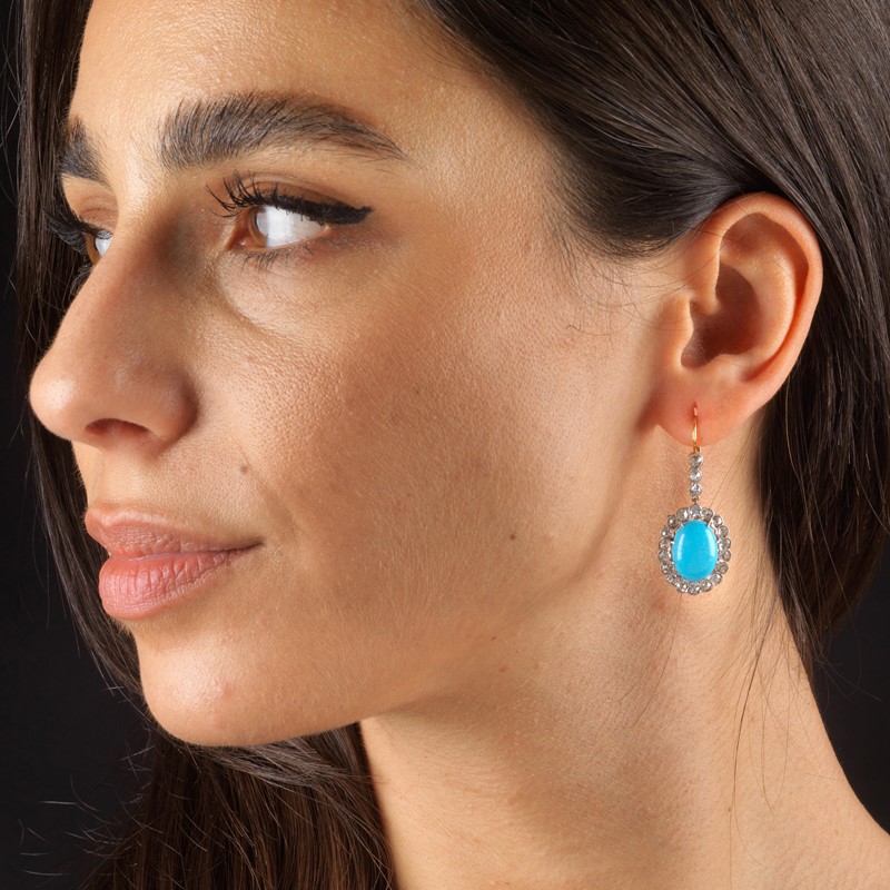 PAIO DI ORECCHINI PENDENTI CON PASTA DI TURCHESE E DIAMANTI in oro giallo e bianco 18kt, impreziositi al centro da pasta di turchese taglio cabochon circondati da una fila di diamanti taglio vecchio per ct 2 circa, lungh. cm 1,5x3,5, gr. 8 complessivi