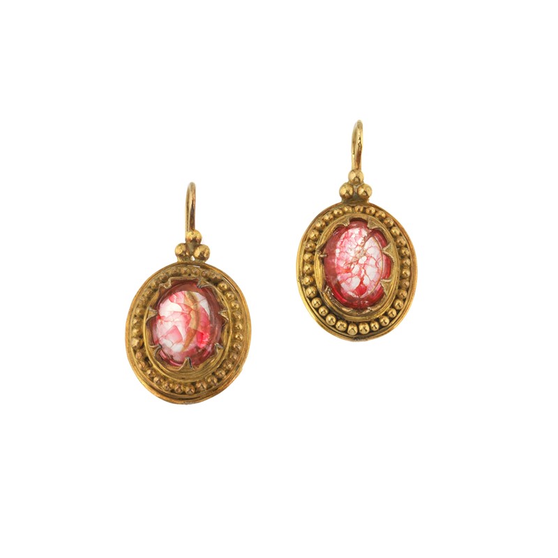 in oro giallo 18kt, di forma ovale, con al centro pietre sintetiche taglio cabochon cinte da microgranuli, dim. cm 1,5x3, gr. 6 complessivi
