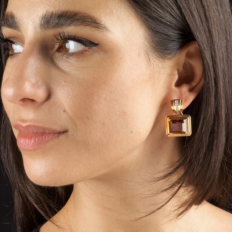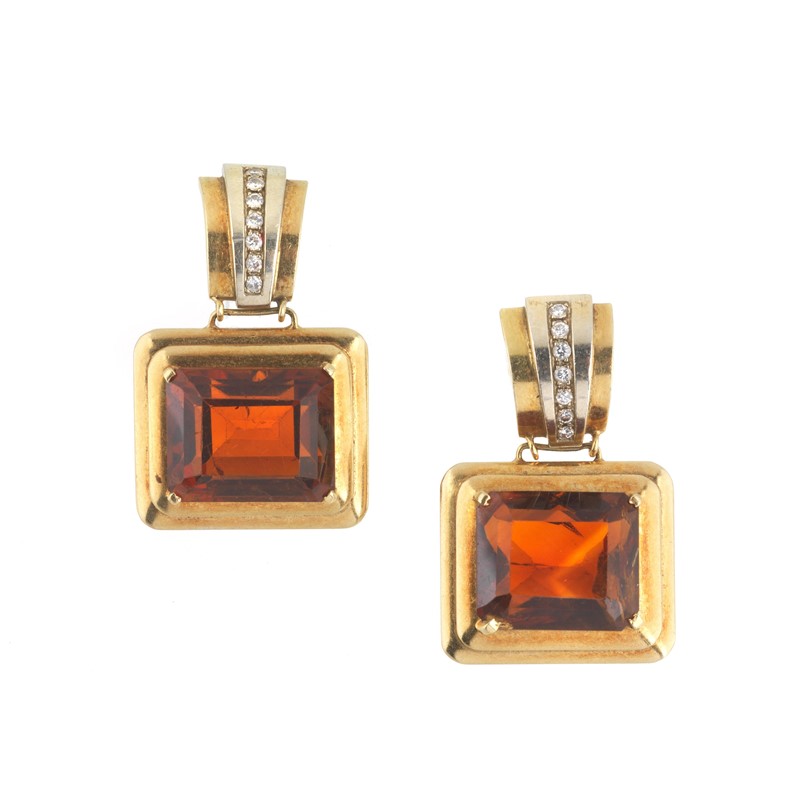 PAIO DI ORECCHINI PENDENTI CON QUARZI E DIAMANTI in oro giallo e bianco 18kt, impreziositi da diamanti taglio brillante per ct 0.10 circa e due quarzi taglio ottagonale, dim. cm 2x3,5, gr. 23 complessivi