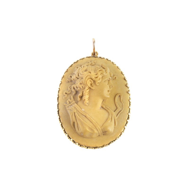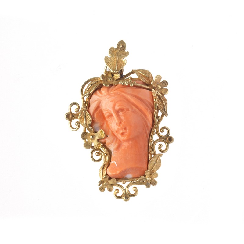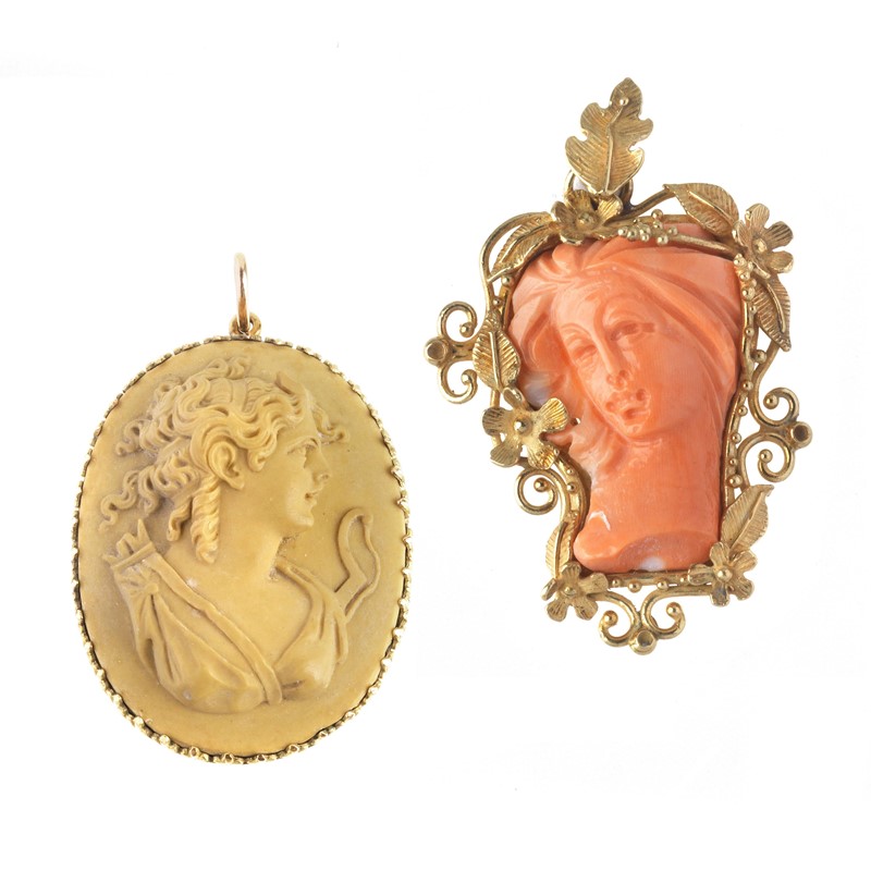 di cui uno in oro giallo 18kt, raffigurante un volto femminile in corallo inciso cinto da una tralcio fiorito, punzoni 750 e del fabbricante, dim. cm 3x4,5, accompagnato da un secondo ciondolo con cammeo in pietra lavica, raffigurante un profilo femminile inciso e a rilievo, cornice con passante in oro a basso titolo, dim. cm 3x4 circa, gr. 23 complessivi