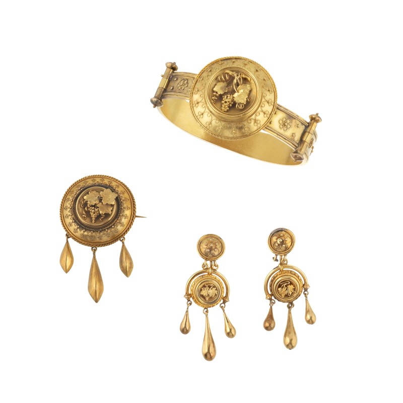 in oro a basso titolo, composta da un bracciale rigido di diam. interno cm 6, una spilla di dim. cm 3x5 e un paio di orecchini pendenti con chiusura a vite di dim. cm 1,5x5, gr. 40 complessivi